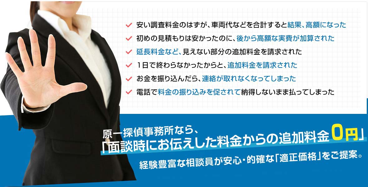 「調査料金」を気にされている方は多いと思いますが、原一では以下のような