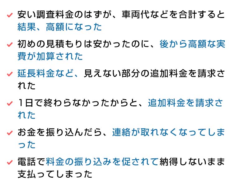最初に少ない金額を見積もっておいて、「証拠が掴めそうだから」と追加料金を請求する悪質な業者もあるそうです。
