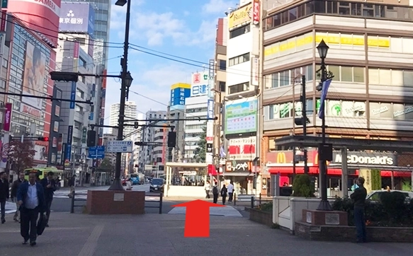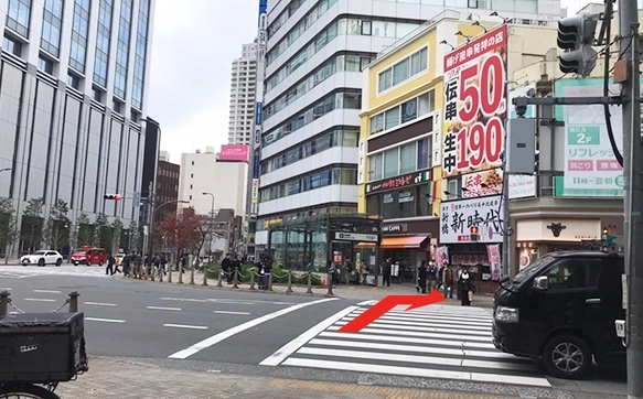 出たら目の前の交差点横断歩道を渡り直進する。